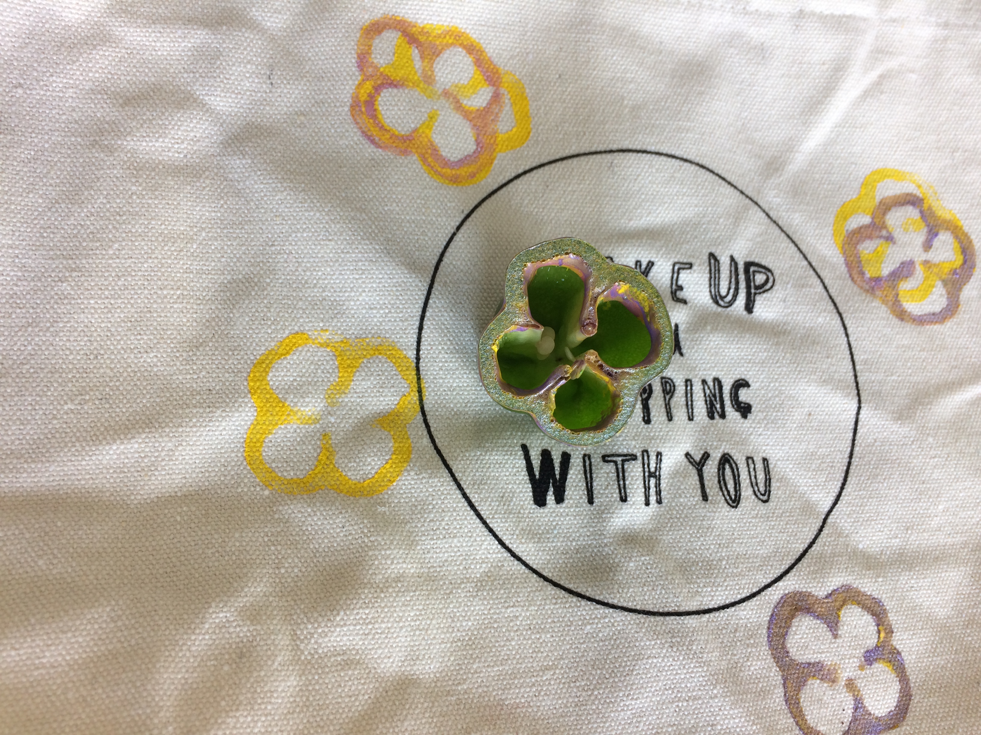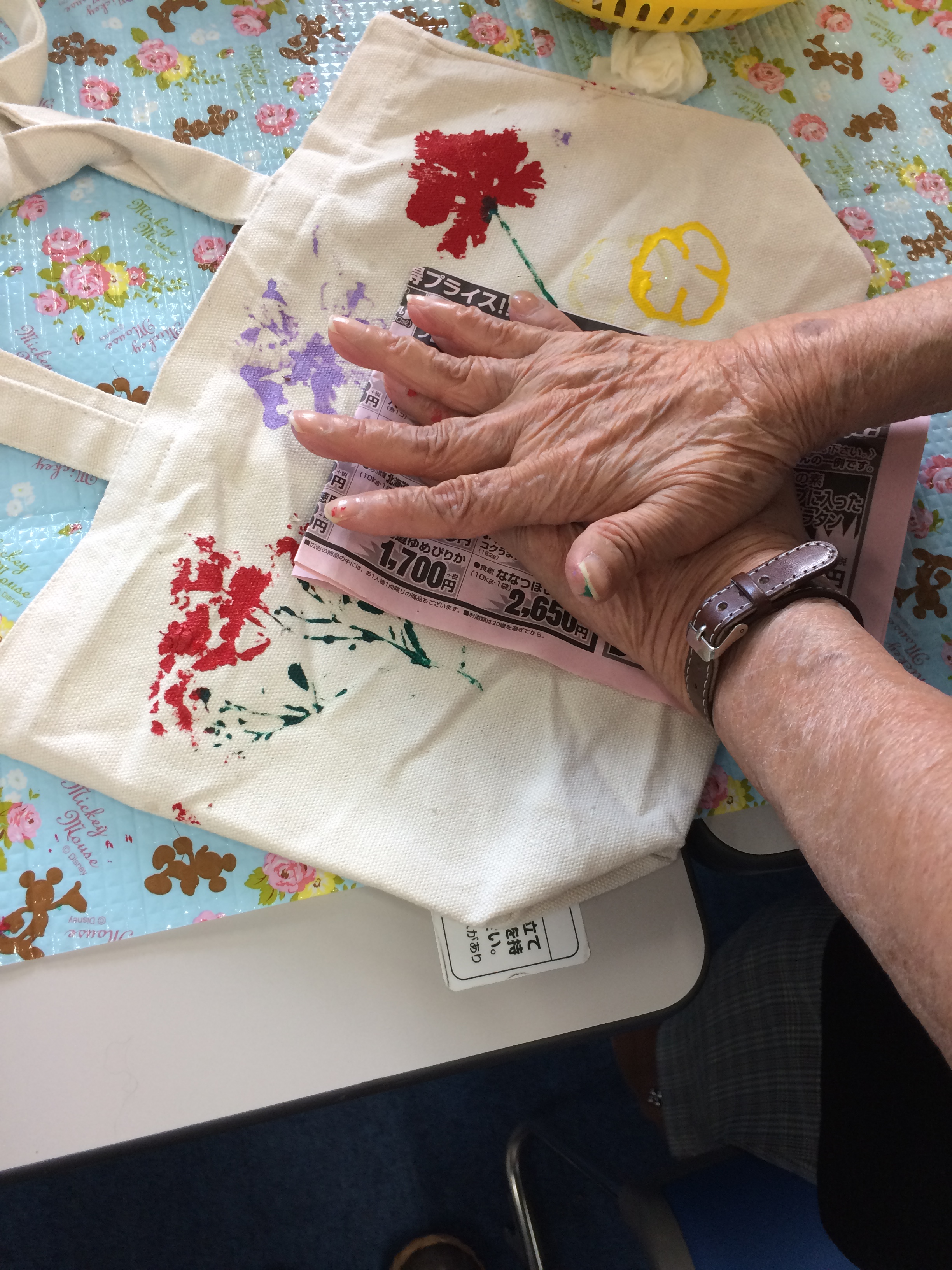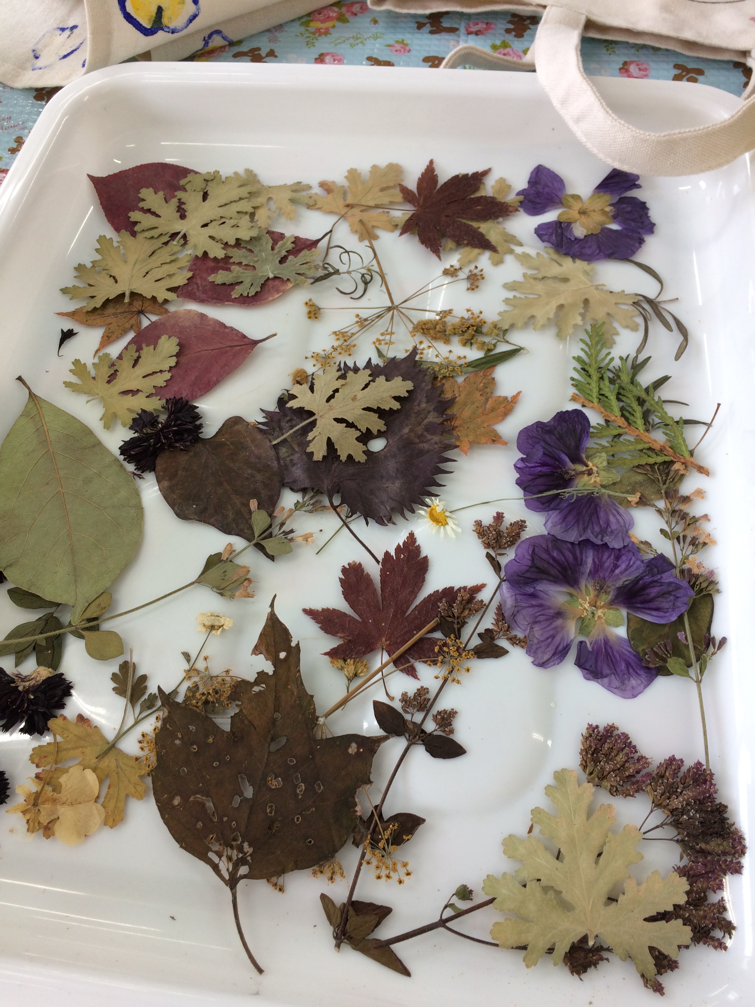 先週は押し花や落ち葉を使ってバッグにプリントを